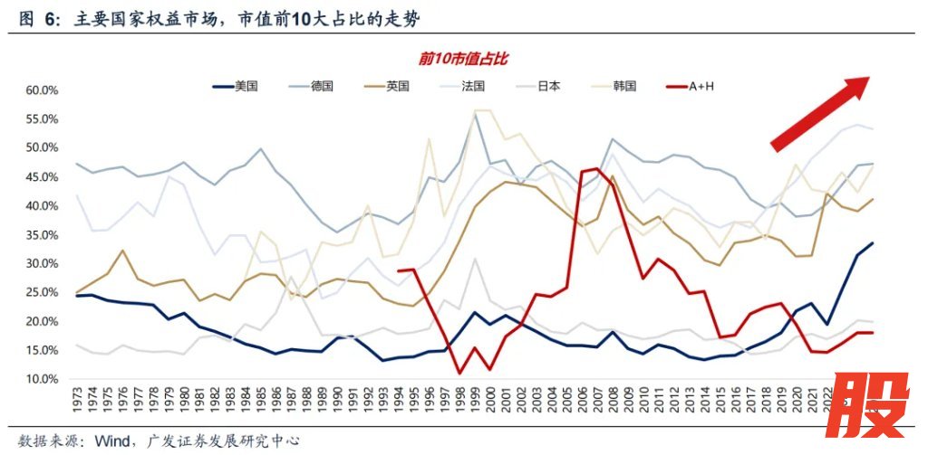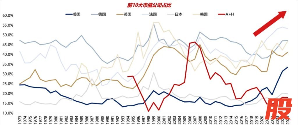 从趋势来看,2020年之后,多数国家权益市场的权重市值占比持续提升,目前已创下新高或接近历史高位。相比之下,AH股的市值集中度,近几年趋势上仍在走低,曾经的高位出现于2007-2008年,彼时权重股是中石油、工行、建行、人寿、神华等。