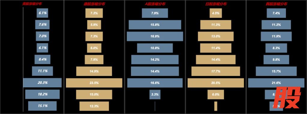(1)上涨结构:“二八分化”。美国、德国、日本、韩国股市,2025年下跌个股占比56%、51%、29%、35%; A股有一定普涨特征,下跌比例仅为18%。