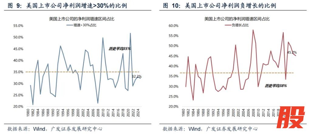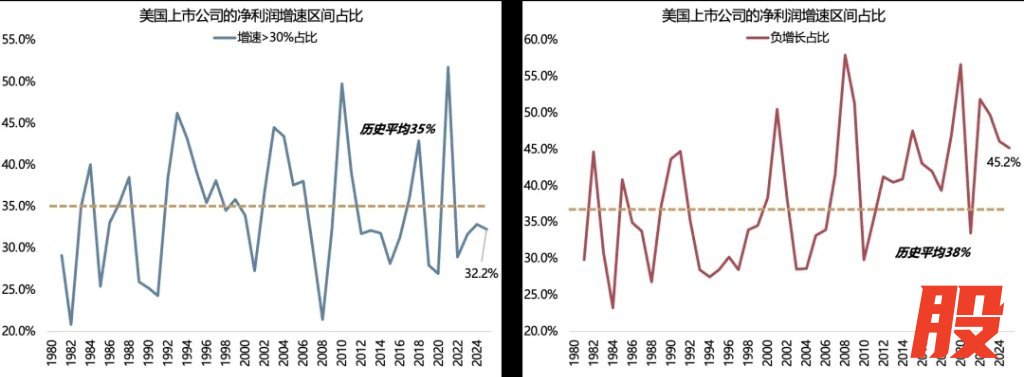 美股牛市虽然已持续了3年,但盈利高增长的公司仍然是稀缺的,当前(截至202511)美股上市公司净利润增速>30%的比例为32%,低于历史均值的35%;同时,负增长的比例为45%,高于历史均值的38%。