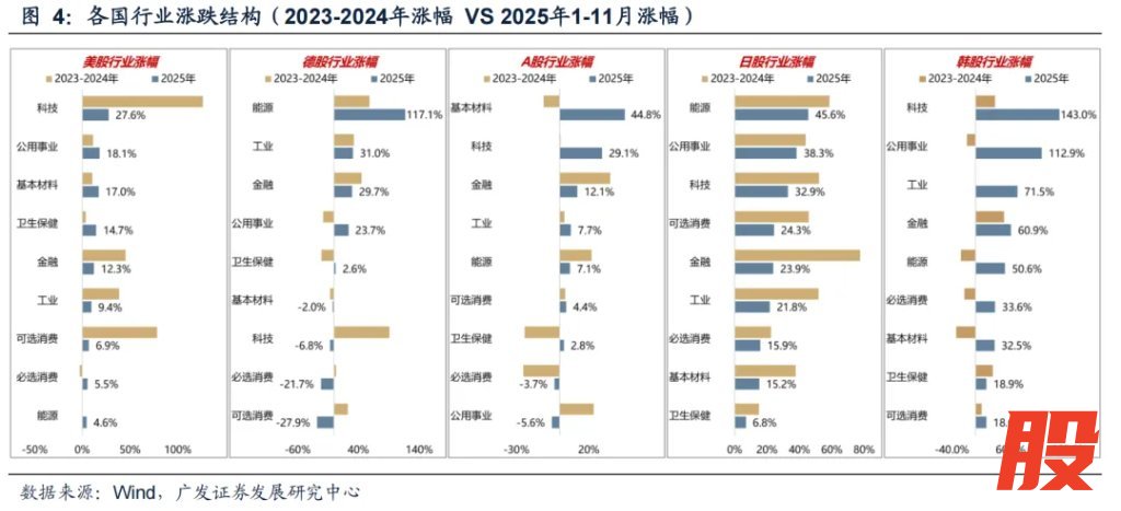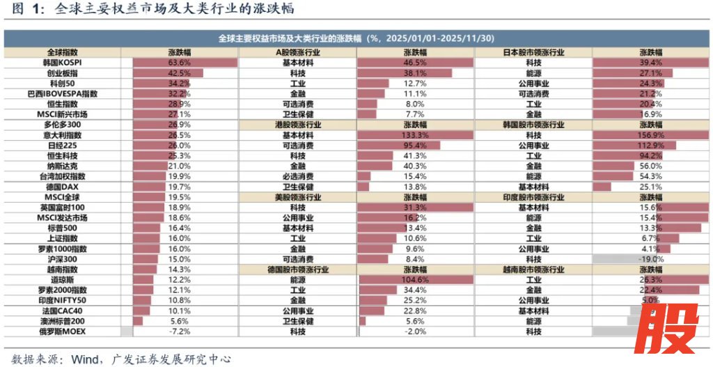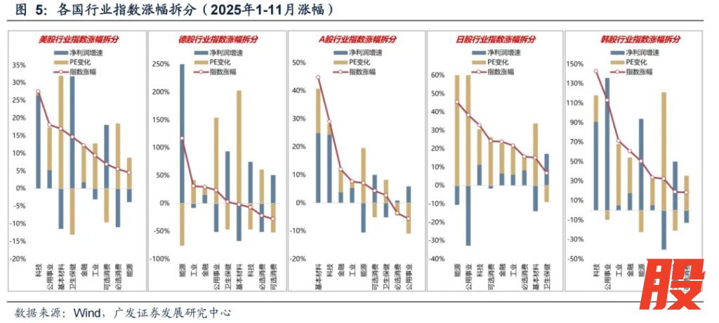 另外,全球牛市的背后,估值贡献了很大一部分,但领涨的板块多数都有强劲的盈利支撑。比如,2025年1-11月,美国涨幅第一的科技板块,上涨26.7%、盈利增长26.4%、估值贡献0.9%;韩国涨幅第一的科技板块,上涨143.0%、盈利增长90.9%、估值贡献27.3%。