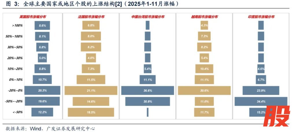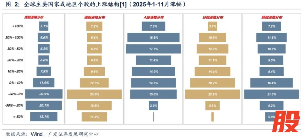 其中,截至2025年11月,美国、德国、日本、韩国股市,2025年下跌个股占比分别达到56%、51%、29%、35%;相比之下,A股有一定普涨特征,下跌的比例仅为18%。