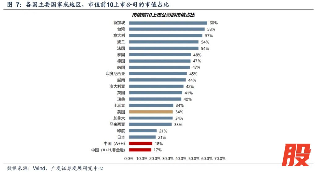另外,发展中国家的市值集中度相对较低,比如越南的44%、马来西亚的33%、印度的21%。而,中国(包含A股+港股中资股)上市公司的市值集中度最低,目前仅为18%;非金融部分的集中度更低,仅为17%。