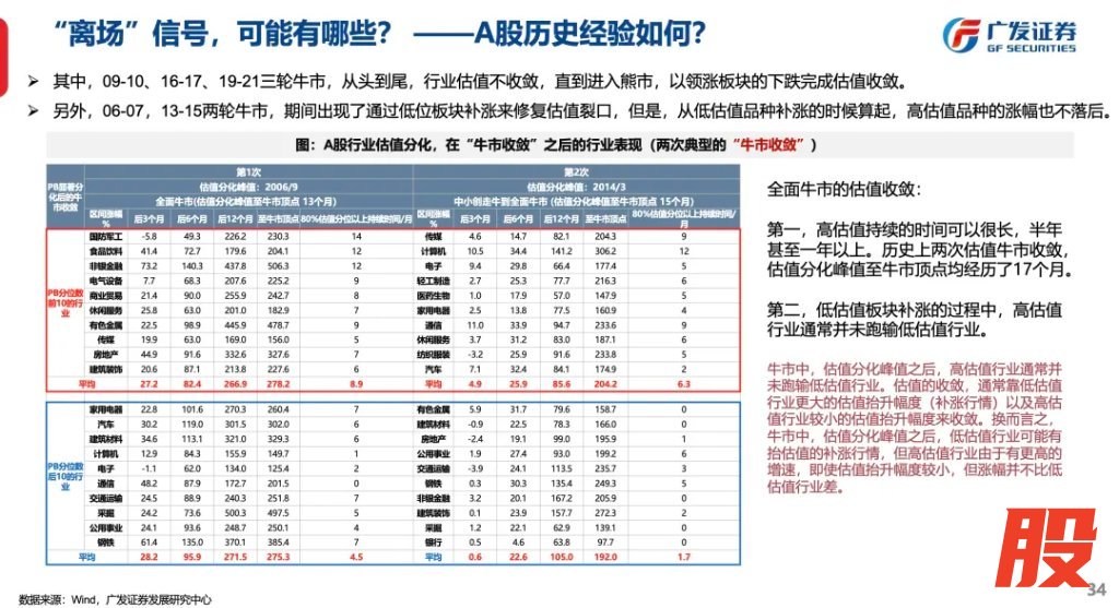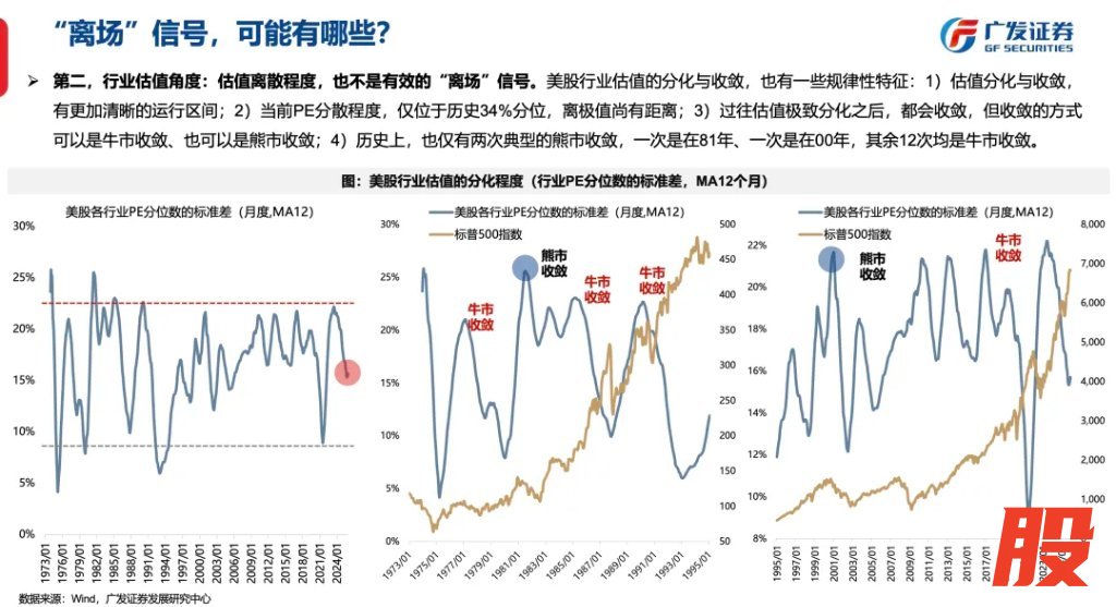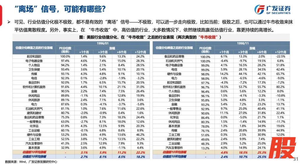 (2)“离场”信号,可能有哪些? ①行业涨幅离散程度、②估值离散程度、③市值占比、④成交额占比,均不是有效的“离场”信号。其中,美股过往估值极致分化之后,仅有两次典型的熊市收敛(1881年加息末期/衰退;2000年加息末期/衰退),其余12次均是牛市收敛。而牛市中的估值收敛,高估值板块往往也表现很不错,不会跑输低估值的补涨。