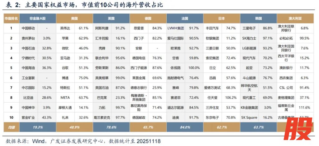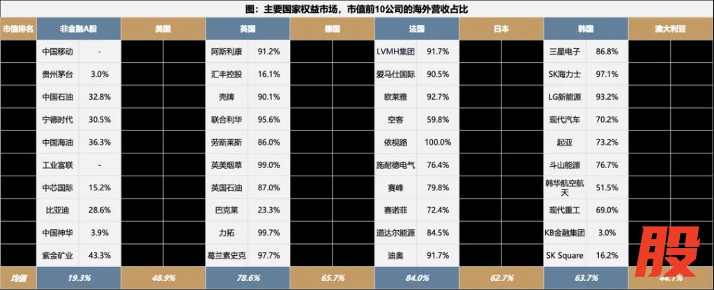 主要国家权益市场,市值前10的非金融公司,绝大部分高度全球化,海外营收占比在60%甚至90%以上,集中在科技、制造、资源、可选等行业,金融、必选等通常偏低。相比之下,目前非金融A股,大市值公司的海外营收占比仍然偏低,这也是A股市值集中度偏低的重要原因之一。