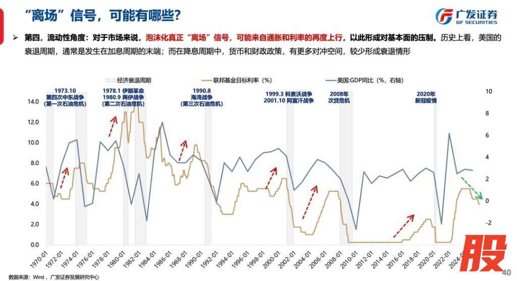 (3)泡沫化真正“离场”信号,可能来自通胀和利率的再度上行,以此形成对未来基本面的压制。而在降息周期中,尤其叠加中期选举,货币和财政政策,有更多对冲空间,较少形成衰退情形。