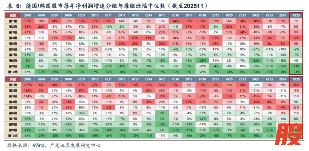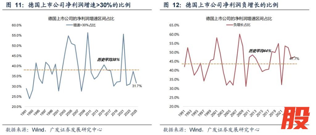德国的盈利结构也较弱,当前(截至202511)德国上市公司净利润增速>30%的比例为31.7%、负增长的比例达到47.7%,均比历史平均水平要弱,特别是2025年的整体盈利情况并未比上一年改善。