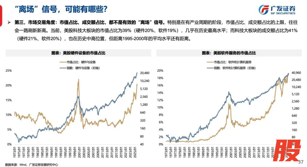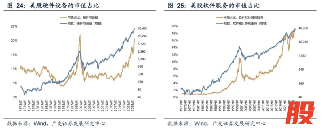 当前,美股科技大板块的市值占比为39%(硬件20%、软件19%),几乎在历史最高水平;