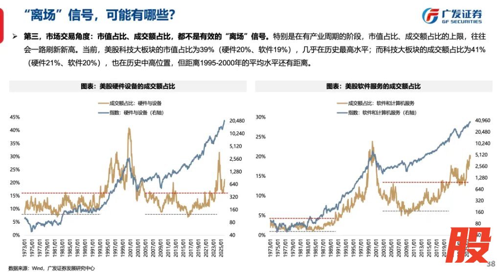 而科技大板块的成交额占比为41%(硬件21%、软件20%),也在历史中高位置,但距离1995-2000年的平均水平还有距离。