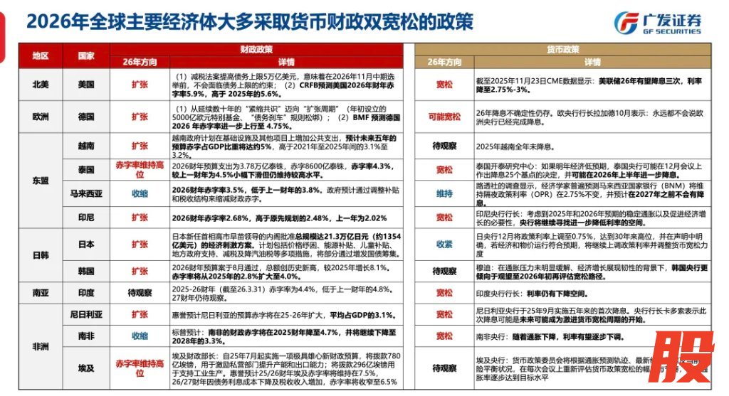 展望2026年:预计美联储在2026年降息两次;欧洲央行可能按兵不动,因德国财政刺激带来的增长;日本央行因其通胀担忧、且日元贬值压力加大,或成为唯一加息的主要央行;新兴市场多数也在宽松周期中,但可能仅小幅宽松,反映其外需有支撑但内需偏弱。