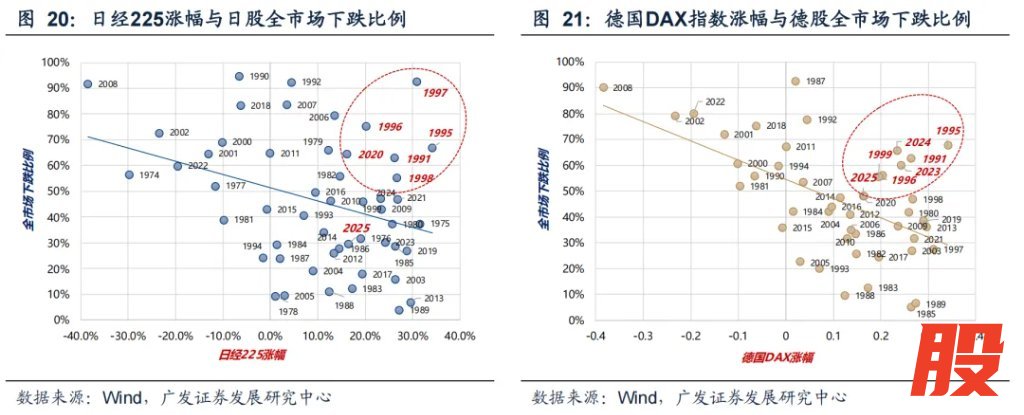 其他国家的股市,以日本和德国为例,市场极致的上涨结构(指数大涨+个股普跌),基本也都是存在于1995-2000年、以及2023-2025年这两段时间。