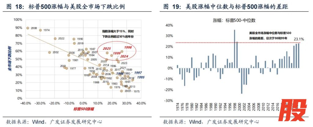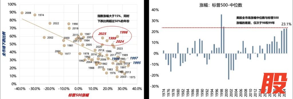 (3)2024-2025年(截至当前):加息周期结束后,通胀回落、经济未衰退、就业韧性强,但从市场表现看,这一阶段的上涨结构,并不是典型的“金发女孩”特征,股市的涨跌结构很极致——指数大涨(涨幅超过15%)+全市场下跌比例过半——同时存在,更像“金发女孩”后半段的1998-1999年。