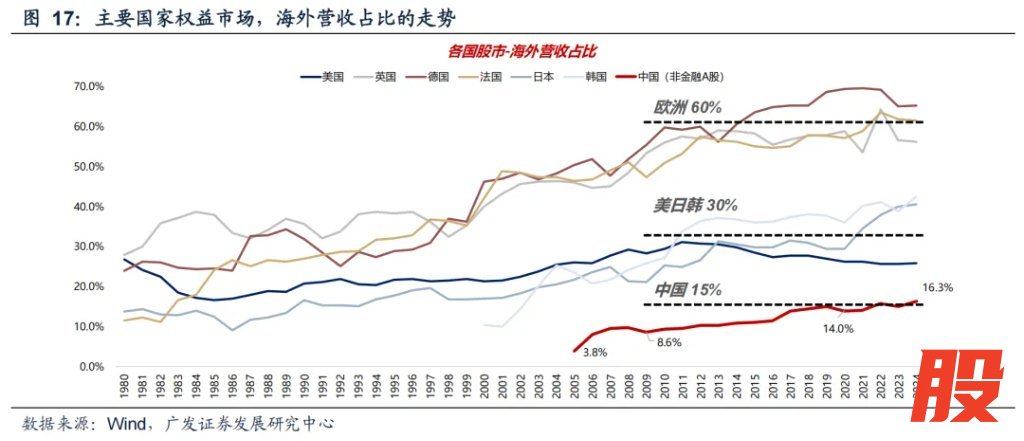 A股的海外收入占比,在过去20年持续提升,但和主要发达国家相比,占比仍低。主要国家权益市场,海外营收占比分三个梯队: