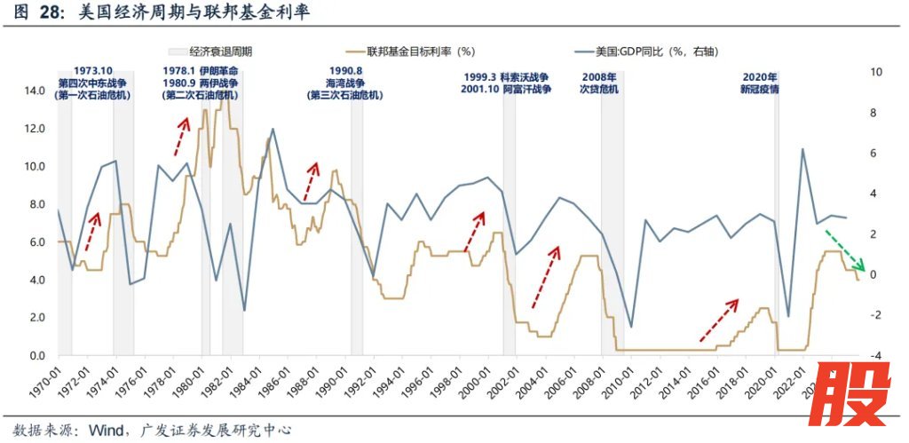 历史上看,美国的衰退周期,通常是发生在加息周期的末端;而在降息周期中,货币和财政政策,有更多对冲空间,较少形成衰退情形。