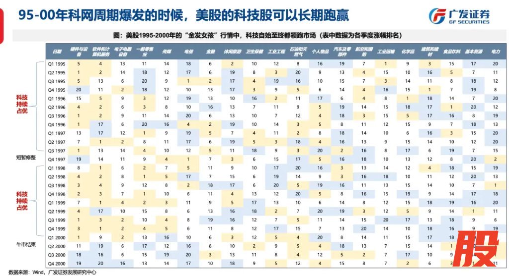 (1)美国 “金发女孩”经济, 最典型的是1995-2000年,由信息技术革命驱动,呈现高增长、低通胀、低失业、温和利率的完美组合,股市上半段普涨、后半段加速。此外还有两个常被提及的阶段: