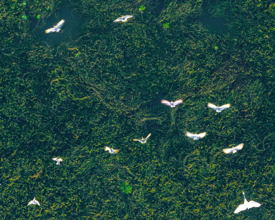 你看,飞鸟掠过,掀起的是生机盎然的碧波,是欣欣向荣的奔流,是合力向前的巨浪。